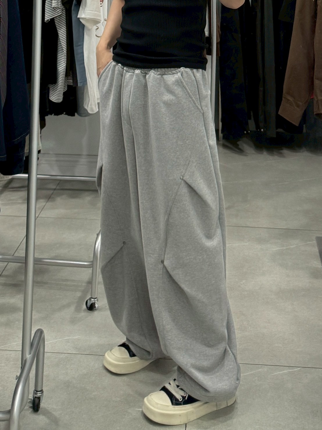 褲長 / 108 腰圍(鬆緊抽繩) / 35-48 褲檔 / 39 大腿圍 / 41 小腿圍 / 38 褲口寬(束繩調節) / 28
